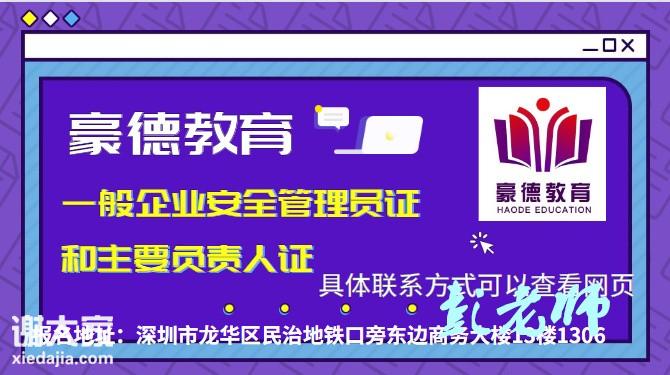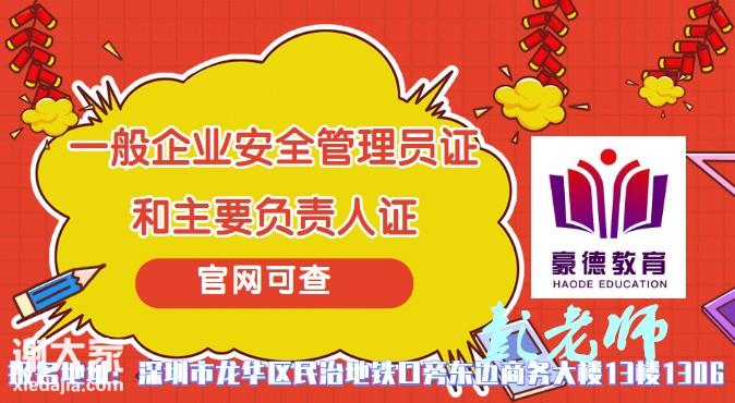 关于2021年广东省深圳市应急管理局颁发的一般生产经营单位安全管理人员与主要负责人安全培训合格证书所需要的报考条件、流程、时间、费用、资料、地点等具体详情请咨询豪德教育彭老师(联系方式如图如示)。 证书名称:安全管理人员证(即原来的安全主任证) 证书名称:主要负责人证(也叫企业负责人证) 报名时间:2021年(正在招生中) 考试时间:参加深圳应急管理局统一考试 办理地址:深圳市龙华区民治地铁站D出口东边商务大楼13楼1306 招生范围:宝安区,龙岗区,南山区,福田区,罗湖区,盐田区,龙华新区,光明新区,坪山新区. 一、企业主要负责人与安全管理人员考证介绍: 一般企业负责人与安全管理人员考试时间统一是由广东省深圳市应急管理局统一安排,考后15个工作日出成绩,考试合格后45个工作日统一由广东省深圳市安全生产监督管理局发放企业主要负责人与安全管理人员证书。 二、深圳企业主要负责人与安全管理人员考证报名资料: 报名资料:身份证正反面复印件一份,一寸白底电子版照片 三、企业主要负责人与安全管理人员考证培训课程: (1)、企业安全管理人员培训课本:《现代安全管理原理》、《现代安全管理事务》; (2)、企业安全管理人员主要授课内容:本专业学习、考试分为“综合知识”和“专业知识”二部分。 (3)、综合知识内容有:安全生产法律法规、安全生产监督管理、安全教育培训、安全行为管理、事故的预防、风险管理与安全评价、安全生产规章制度、安全组织机构的组建、从业人员的安全管理、工伤保险。 四、企业主要负责人与安全管理人员考证科目及题型 只设理论考核一个科目,实行计算机闭卷电脑考试;采用标准化题型,满分100分,80分及以上为成绩合格;考试时间为60分钟,只考单选题,共60道题。发APP题库练题,目前通过率高。 五、证书颁发机构:简称深圳市应急管理局 企业安全管理人员及企业主要负责人证报考情况参照如下:学校:深圳豪德教育培训学校发证机关:深圳市应急管理局上班时间:上午9:00--下午20:00(礼拜正常值班)联系方式:彭老师(联系方式可查看网站)报名地址:深圳龙华新区民治地铁D出口旁东边商务大楼13楼1306乘车路线:地铁:环中线5号线-民治站D出口(深圳北站的下一站);公交:沙元埔站或者民康路口站。期待您的咨询,真诚的为您解决问题,合作共赢。