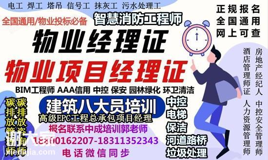 全国高级物业职业经理人、AAA信用证,BIM,建筑八大员,碳排放管理师,碳排放咨询师,碳排放评估师,EPC工程总承包项目经理、监理工程师,人力资源管理师,中控安全管理师,环卫管理,垃圾处理,园林绿化,低压电工,高压电工,有限空间,焊工塔吊信号工装