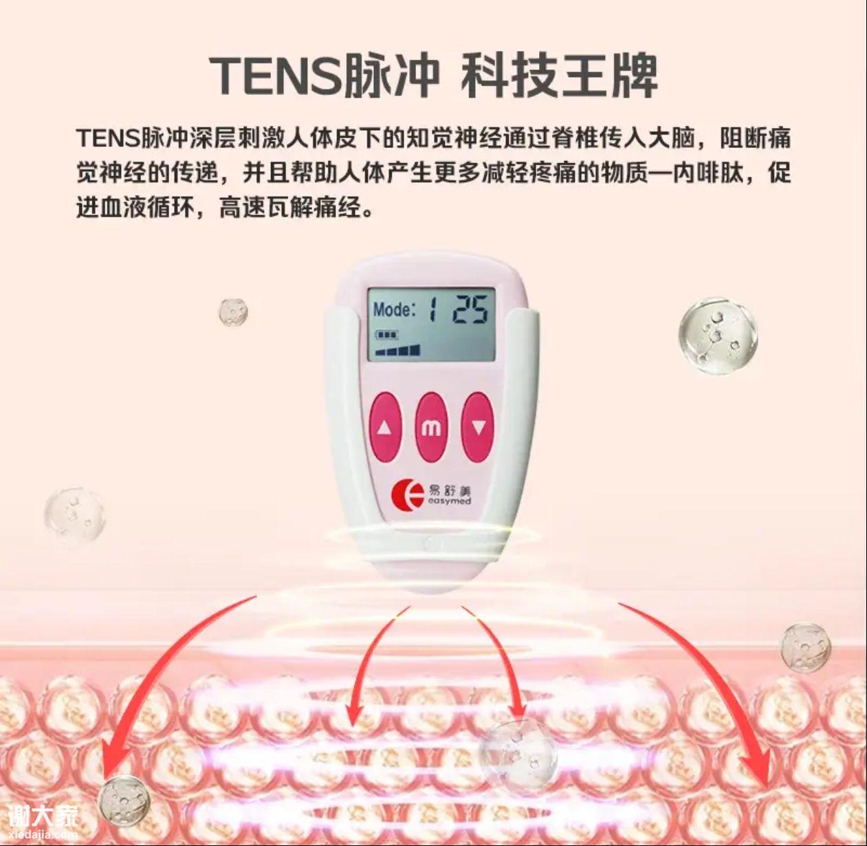 TENS经皮神经电刺 激技术,而非单纯热敷或按 摩。不同于长期吃布洛芬伤肠胃、有纟芍物依赖的弊端,易舒美通过温和的低频脉冲,阻断痛觉信号传递,同时促进身体分泌内啡肽——人体自带的“天然止痛纟芍”,3分钟就能感受到痛感缓解,15-30分钟可明显减轻不适,轻中度痛经甚至能完 全摆脱疼痛困扰。实测显示,重度痛经使用者也能缓解60%-70%的不适感,不用再卧床硬扛,正常工作生活不受影响。